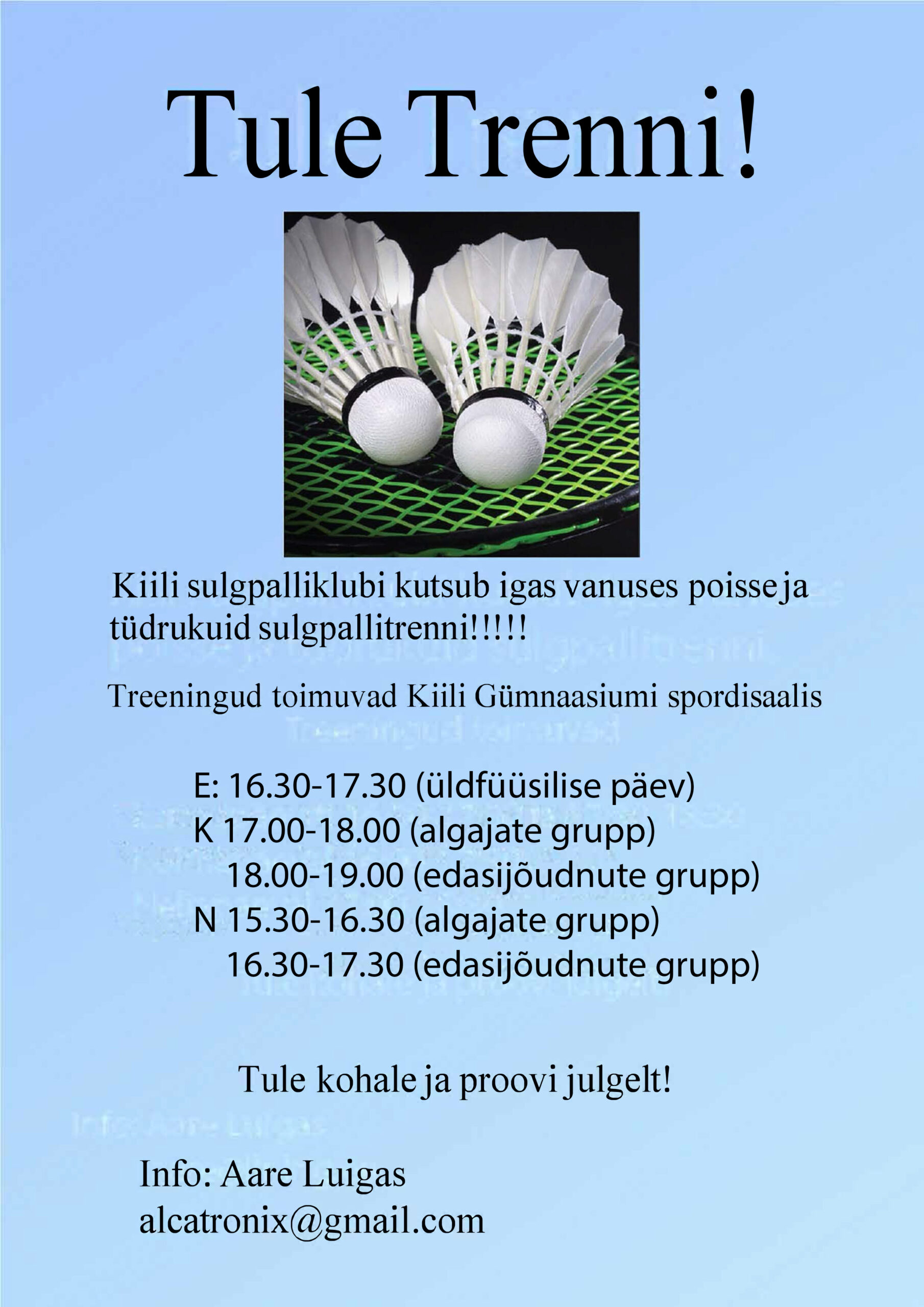 1 x nädalas : 35 euri 2 x nädalas: 60 euri 3 x nädalas: 85 euriTreeningud toimuvad järgmistel aegadel Kiili Gümnaasiumi spordisaalis: