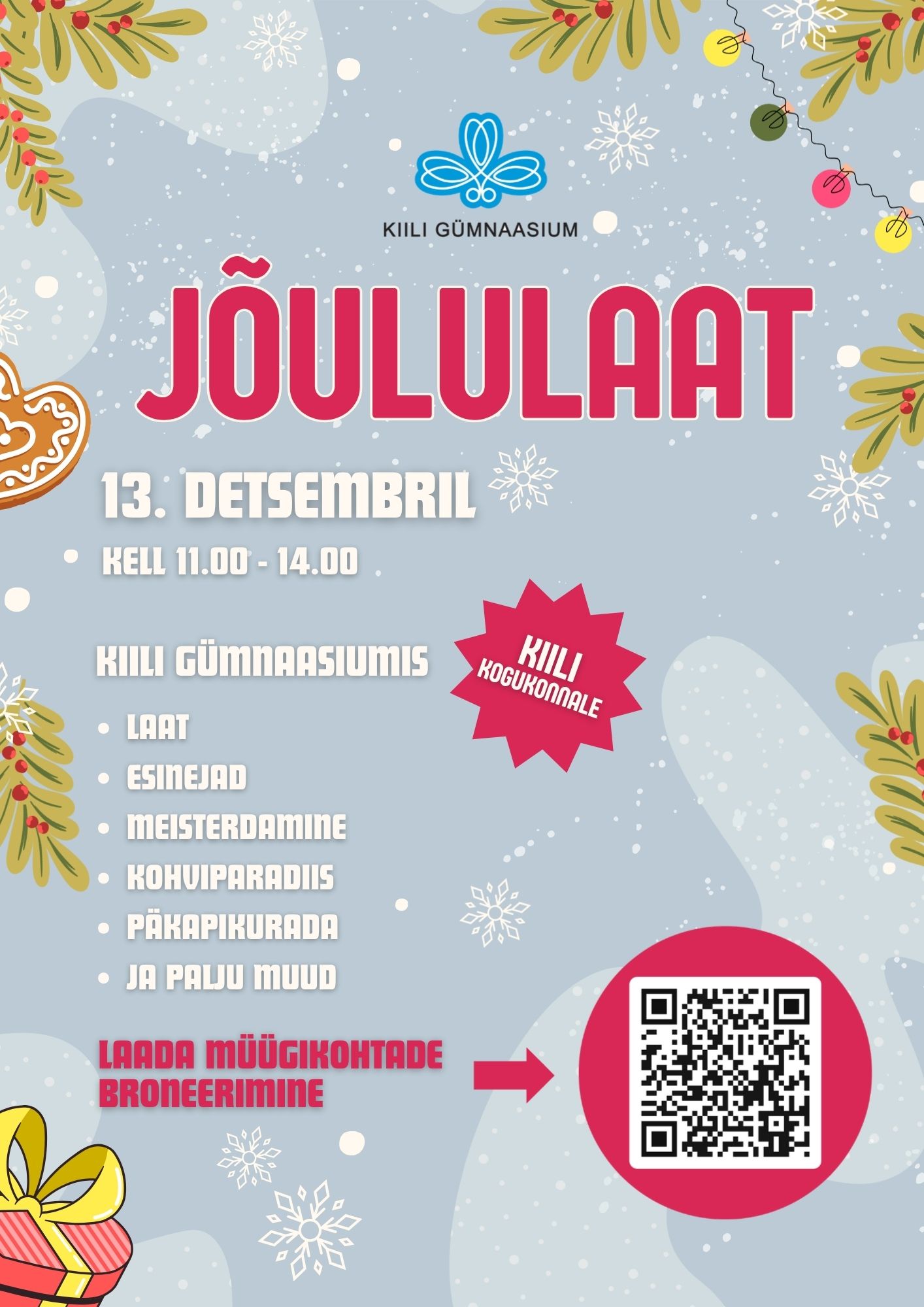 Jõululaat tuleb taas. 13. detsembril kell 11.00 – 14.00 on Kiili Gümnaasiumi uksed avatud kõikidele Kiili elanikele ning miks mitte ka kaugemalt külla tulnud sõpradele ja tuttavatele.