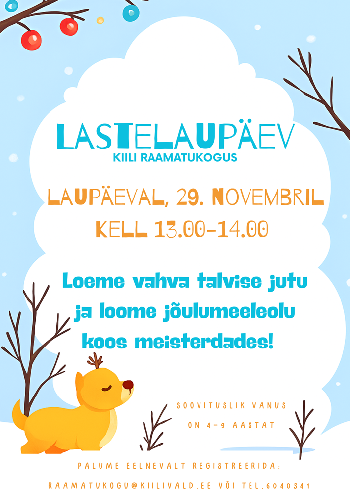 29. novembril kell 13.00–14.00 toimub lastelaupäev, kus tekitame jõulumeeleolu talvise jutu ja jõuluehte meisterdamisega.