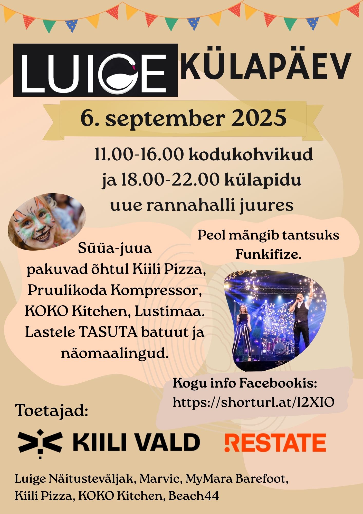 Õhtusel külapeol esineb Funkifize, saab osta süüa-juua (Kiili Pizza, Pruulikoda Kompressor, Lustimaa, KOKO Kitchen). Lastele TASUTA batuut ning näomaalingud ja glittertattood.