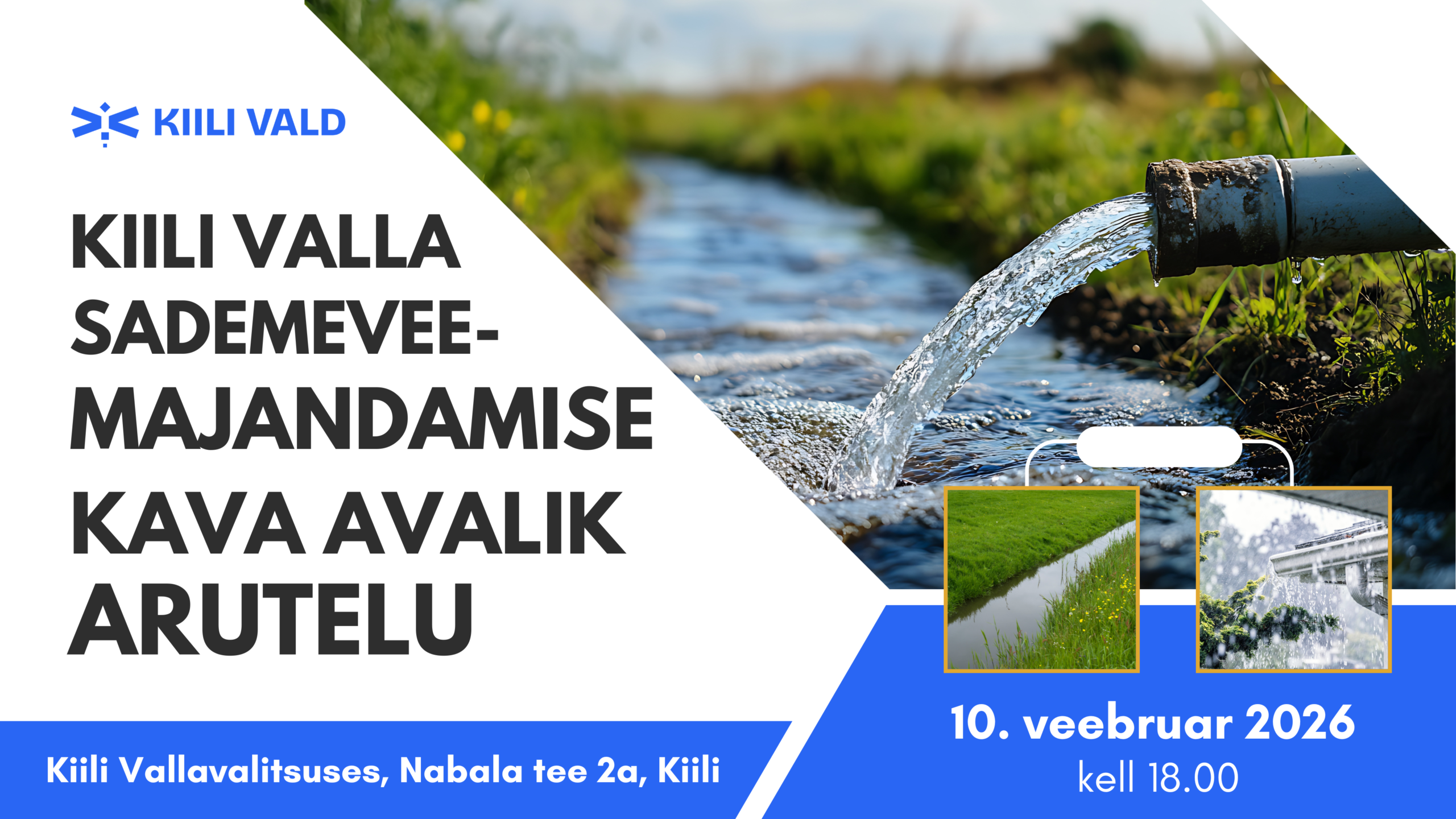 -Kiili valla sademevee majandamise kava avalik arutelu toimub 10. veebruaril 2026 kell 18.00 Kiili Vallavalitsuses aadressil Nabala tee 2a, Kiili.