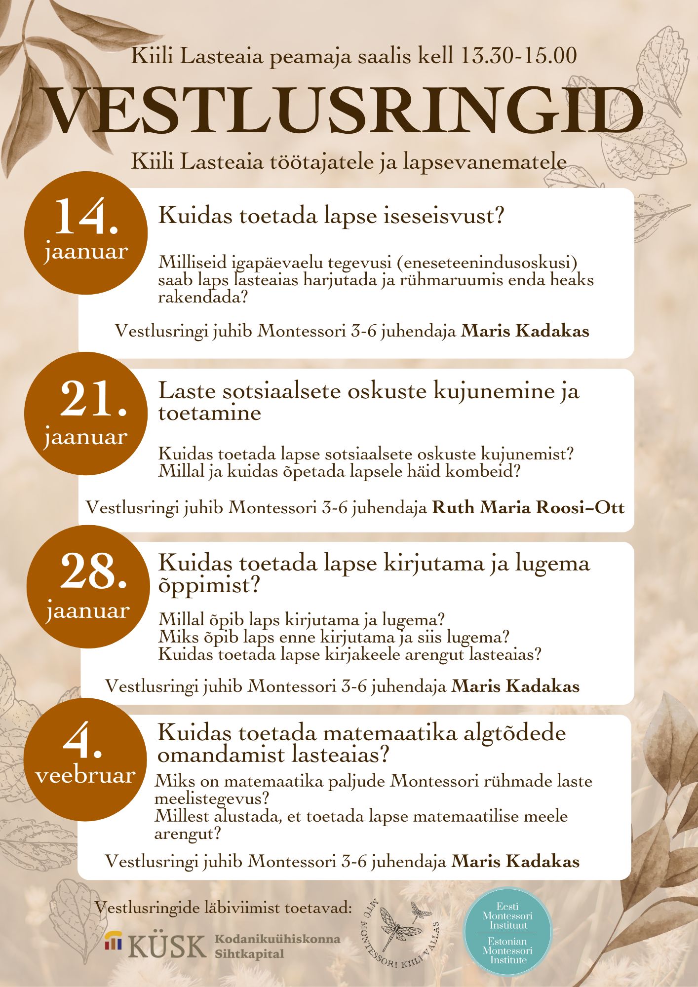 MTÜ Montessori Kiili vallasOlete oodatud osalema vestlusringides, mis pakuvad võimalust täiendada oma teadmisi ning saada praktilisi ideid ja oskusi Montessori pedagoogikast. Üritustele on oodatud kõik haridustöötajad, lapsevanemad ja Montessori-huvilised.